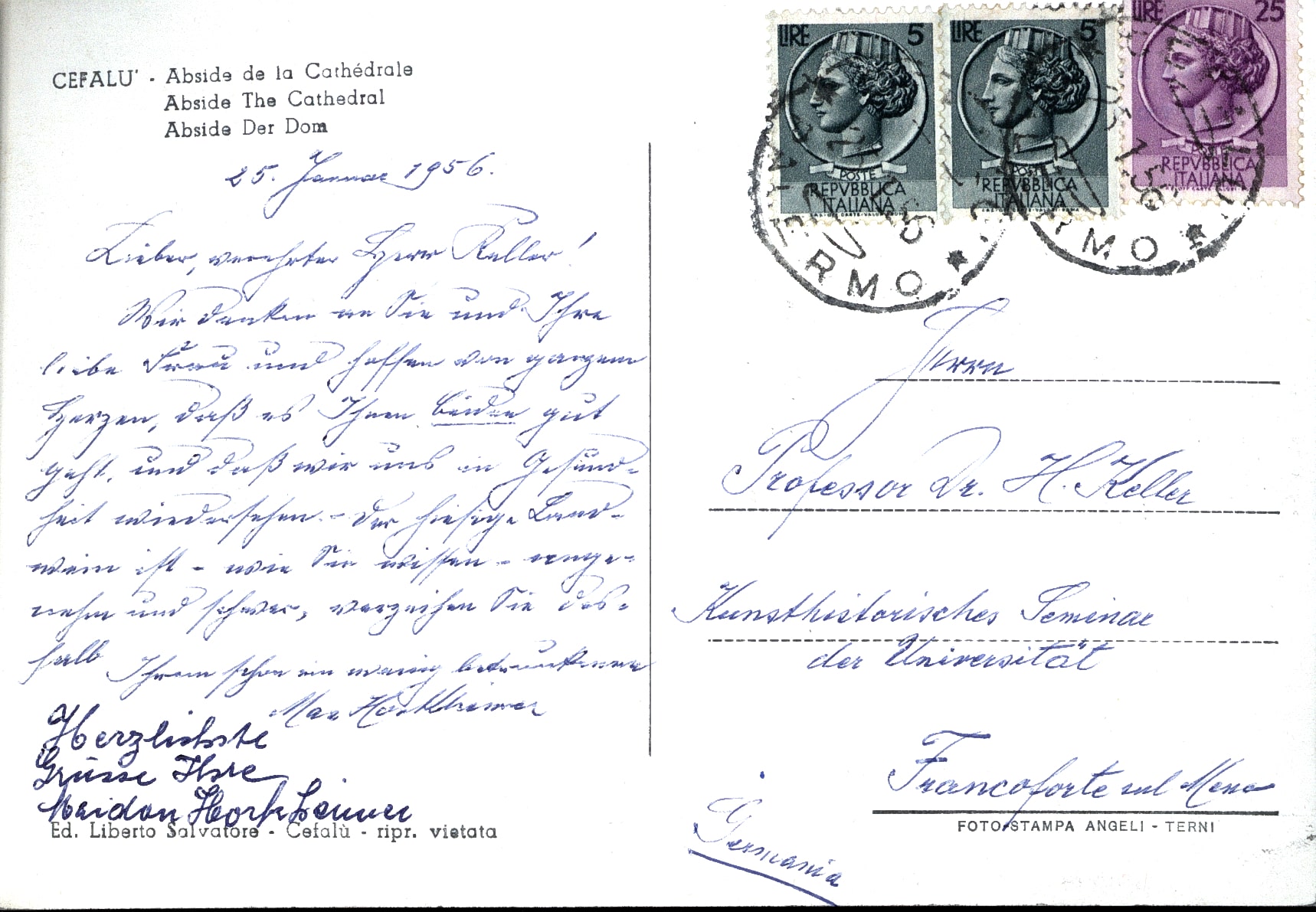 Ansichtskarte von Max Horkheimer an Harald Keller, 25. Januar 1956